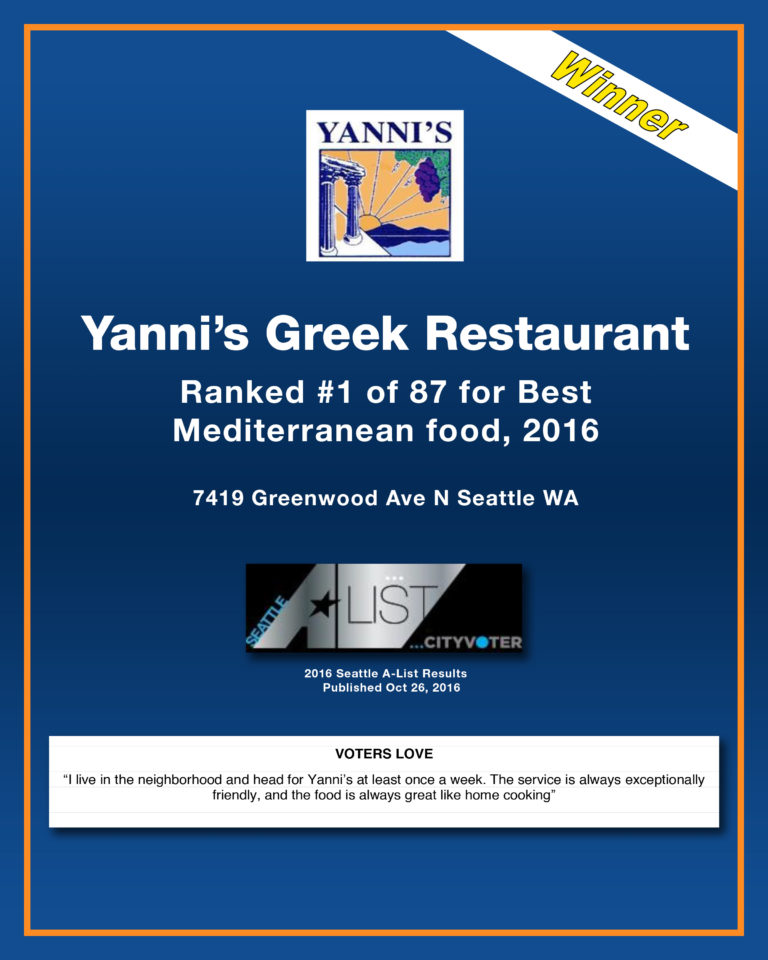 Yanni’s restaurant (formerly Lakeside Café) is family owned and operated since 1984 in the Greenwood/Phinney Ridge area of North Seattle.  We take pride in our hospitality, customer service and especially our preparation of the authentic Greek food we serve.